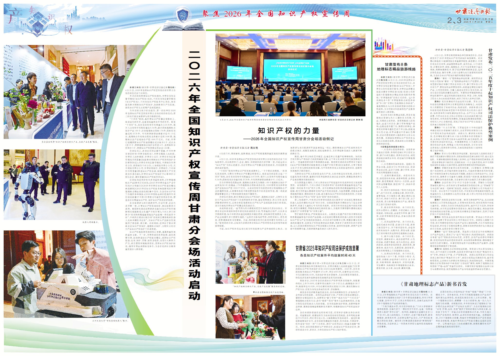 活動現場還同步發布多項重要成果,《甘肅地理標志產品》新書正式首發;《2025年甘肅省重點產業專利統計分析報告》《2026年甘肅省知識產權強省建設典型案例》《2025年省知識產權服務典型案例》《甘肅地理標志精品旅游線路》集中發布,為全省知識產權工作提供參考借鑒;《2026年商標品牌價值提升專項行動》《跟著IP中國(甘肅篇)》專題宣傳同步啟動,營造全社會尊重知識產權、保護知識產權的良好氛圍。